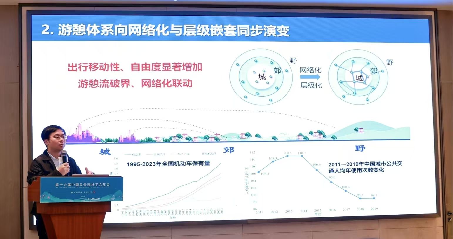 高翅教授、吴雪飞教授、张斌教授应邀参加了常务理事会议、省级学(协)会理事长(会长)座谈会等,邵继中教授担任“水利风景与生态修复”分会场上半场主持人。刘文平教授在“公园运营与存量发展”分会场作了题为《都市圈一体化驱动下绿色空间多层级游憩服务流特征》的学术报告,分享了新时期城乡绿色空间的游憩行为与活力的多尺度特征,获得与会专家的广泛关注与积极评价。